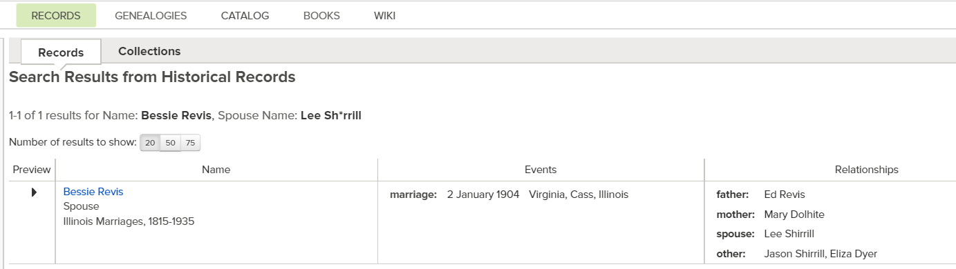 I typed in her first and last name. I used the "Any Place" search box by clicking "Any" and added the location. Be sure to ONLY use a county name and state, don't worry about a city, even if you know it. I left the year span empty. I am hoping to find her husband's first name, so in the "Search with a relationship" field, I chose "Spouse" and used the last name of "Sherrill". Here are the results: